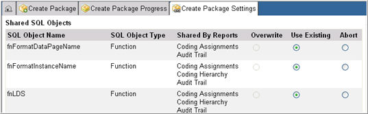 During report package creation, Report Packager extracts the report files, the report settings, and the report SQL objects for the selected reports. At the end of an error-free export process, the system displays the Overwrite Permissions settings page to set the overwrite settings for the SQL objects before proceeding to download the package.