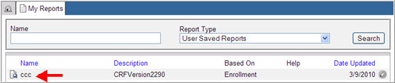 The system saves the report parameters and routes the user back to the My Reports page. The report appears on the My Reports list as a user saved report and this is indicated by the