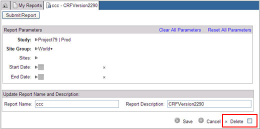 Filter and select a User Saved Report that you want to delete from the list of reports on the My Reports page.
