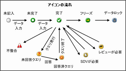 被験者、フォルダ、フォーム、フィールドなどのライフサイクルは、未記入から始まり、完了またはデータロック済みに進む論理的な流れになっています。EDCモジュール全体において、ステータスを示すにはグラフィックアイコンが使われています。