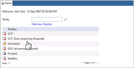 EDC home where a link "eLearning Required" will appear next to a Study name that requires eLearning to be completed.