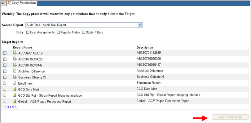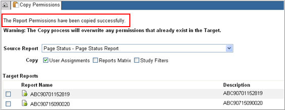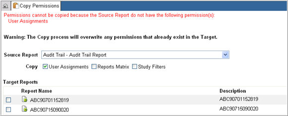 Select and check box one or more reports in the Target Reports table to copy the permissions over from the Source Report.