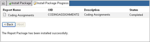 Note: If during installation you click the Abort button, the system will stop installation and roll back any installation work related to the report that is currently being installed. A message will display which reports were installed and which reports were not installed.