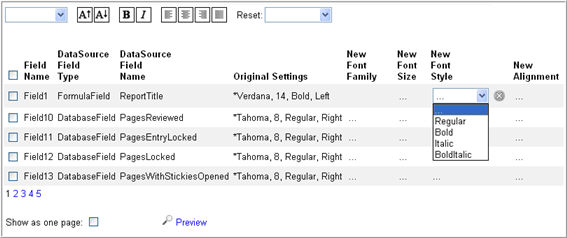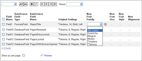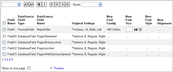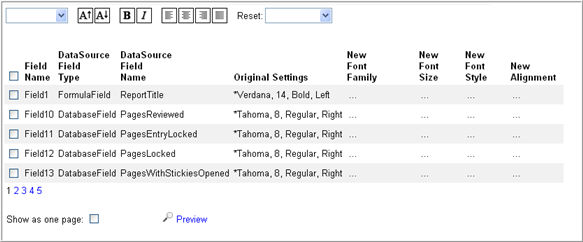 Check box next to the Field Name in the data grid to apply changes made in the Adjust Font and/or Adjust Font size at the top of the page to the selected field. When the box to the left of the label Field Name is checked, all fields in the column will be checked.