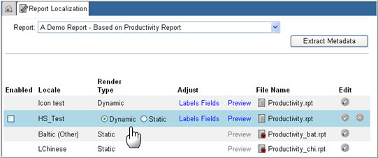 A user can enable a report to display in a specified locale and set the report to render in a Dynamic or Static manner. When set to Dynamic, the report will be dynamically translated to the user's locale when the report is displayed. When set to Static, the report will be created specifically for the locale.