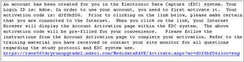 Note: Upon creation, an externally authenticated user who navigates to Rave from iMedidata is automatically considered activated. The Create New Activation and Email Activation links are disabled in Rave for an externally authenticated user.